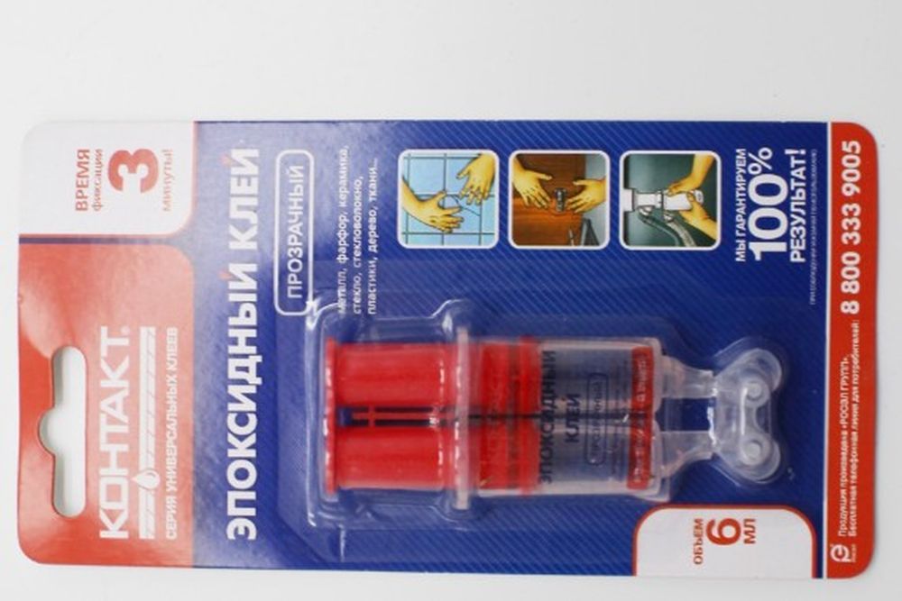 - Эпоксидный. Создан на основе эпоксидной смолы, полученной путем поликонденсации эпихлоргидрина с фенолами и отвердителя (аминного или кислотного). При смешивании эти два компонента вступают в реакцию полимеризации, создавая твердый, устойчивый к воде, маслам, растворителям и перепадам температур шов. Образует жесткие соединения, не дает усадки. Используется для склеивания металла и большинства видов пластика, кроме полиэтилена и силикона.