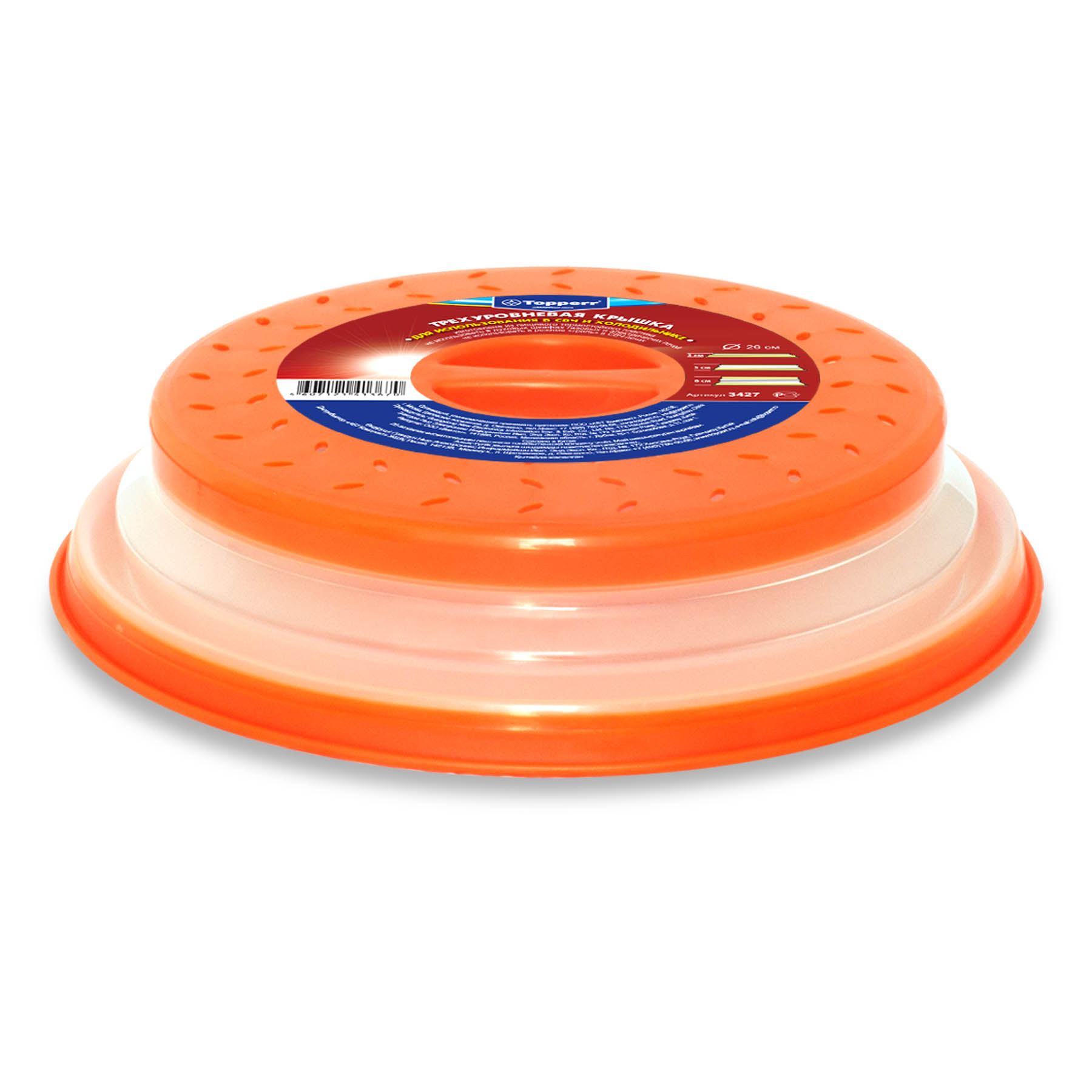 Описание для сайта:Трехуровневая крышка для СВЧ и холодильника, диапазон изменения высоты: 3 см, 5 см, 8 см. Диаметр 26 см.