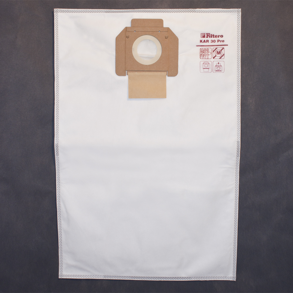 Мешки для промышленных пылесосов Filtero KAR 30 Pro, 3-х слойные, произведены из синтетического микроволокна MicroFib®. Прочность синтетических мешков Filtero KAR 30 Pro превосходит любые бумажные мешки-аналоги, даже если это оригинальные бумажные мешки всемирно известных марок. Вы можете быть уверены: заклепки, гвозди, шурупы, битое стекло, острые камни и пр. не смогут прорвать мешки Filtero Pro. Мешки Filtero Pro не боятся влаги, и даже вода, попавшая в мешок, не помешает вам произвести качественную уборку! Мешки Filtero Pro предназначены для уборки пыли классов «L» и «М».