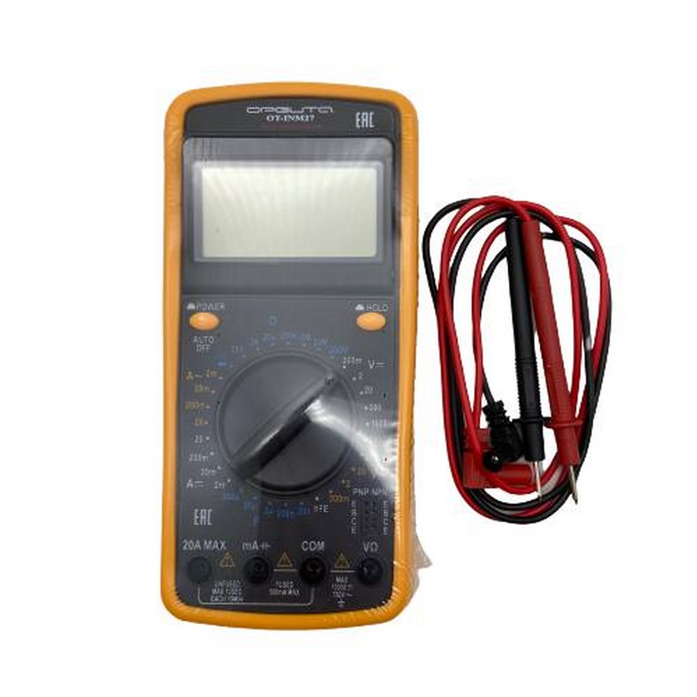 Мультиметр цифровой DT9202A. ВОЗМОЖНОСТИ ПРИБОРА: Точность базового постоянного тока: ±0.5%. Измерение емкости: от 1 пФ до 20 мкФ, автоматическое обнуление. Измерение сопротивления: от 0.1 Ом до 200 МОм. Индикация неправильно проводимого измерения: да Максимльное значение на дисплее: 1999 (3 1/2 знака) Максимальное напряжение гнезда “СОМ”: 50 В (постоянное) Точность гарантирована при температурах измерения 23ºС±5ºС Диапазон температур: рабочая температура 0ºС - 40ºС Температура хранения: -10ºС - 50ºС Питание: батарейка 9 В / тип крона Индикатор разряда батарейки на дисплее: да Размер : 186х86х41 мм. Вес: примерно 318 г, вместе с батарейкой. ПОСТОЯННОЕ НАПРЯЖЕНИЕ ДИАПАЗОН ТОЧНОСТЬ РАЗРЕШЕНИЕ 200 мВ 100 мкВ 2 В ± 0.5% 1 мВ 20 В 10 мВ 200 В 100 мВ 1000 В ± 0.8 % 1 В Входной импеданс: 10 МОм для всех диапазонов Защита от перегрузки: 1000 В постоянного напряжения для всех диапазонов. (Кроме диапазона 200 мВ, здесь напряжение не должно превышать 250 В). ПЕРЕМЕННОЕ НАПРЯЖЕНИЕ ДИАПАЗОН ТОЧНОСТЬ РАЗРЕШЕНИЕ 200 мВ ± 1.2% 100 мкВ 2 В ± 0.8% 1 мВ 20 В 10 мВ 200 В 100 мВ 750 В ± 1.2 % 1 В Входной импеданс: 10 МОм для всех диапазонов. Диапазон частот: от 40 Гц до 400 Гц (за исключением диапазона 200 В и 750 В, здесь частота не должна превышать 100 Гц) Защита от перегрузки: 750 В среднеквадратичное значение или 1000 В пиковое. ПОСТОЯННЫЙ ТОК ДИАПАЗОН ТОЧНОСТЬ РАЗРЕШЕНИЕ 2 мА ± 0.8 % 1 мкА 20 мА ± 1.2 % 10 мкА 200 мА 100 мкА 20 А ± 2 % 10 мА Защита от перегрузки: предохранитель 0.2 А/250 В (кроме диапазона 20 А) Максимальный входной ток: 10 А (20А не дольше 10сек.) ПЕРЕМЕННЫЙ ТОК ДИАПАЗОН ТОЧНОСТЬ РАЗРЕШЕНИЕ 2м А ± 1 % 1 мкА 20 мА 10 мкА 200 мА ± 1.8 % 100 мкА 20 А ± 3 % 10 мА Защита от перегрузки: предохранитель 200 мА/250 В (в диапазоне 20 А предохранителя нет) Диапазон частот: от 40 Гц до 400 Гц. Максимальный входной ток: 10 А, (20 А не более 10 сек.) Показание: Среднеквадратичное значение. СОПРОТИВЛЕНИЕ ДИАПАЗОН ТОЧНОСТЬ РАЗРЕШЕНИЕ 200 Ом ± 0.8 % 0.1 Ом 2 кОм ± 0.8 % 1 Ом 20 кОм 10 Ом 200 кОм 100 Ом 2 МОм 1 кОм 20 МОм ± 1 % 10 кОм 200 МОм ± 5 % 100 кОм Напряжение разомкнутой цепи 1В. ЕМКОСТЬ ДИАПАЗОН ТОЧНОСТЬ РАЗРЕШЕНИЕ 20 нф 10 пф 200 нф ±2. 5 % 100 пф 2 мкф 1 нф 20 мкф 10 нф Частота измерений: 400 Гц ТЕСТИРОВАНИЕ ДИОДОВ И “ПРОЗВАНИВАНИЕ” ДИАПАЗОН -|>|- Постоянный ток ~1мА обратное постоянное напряжение ~ 3 В о))) Встроенный зуммер Напряжение подает сигнал, если разомкнутой цепи: сопротивление < 30 Ом 3 В ТЕСТИРОВАНИЕ ТРАНЗИСТОРОВ ДИАПАЗОН ПОКАЗАНИЕ УСЛОВИЯ hFE измерение hFE Ток базы - для транзисторов типа 10 мА, PNP и NPN, диапазон Uce = 3 В 0-100b