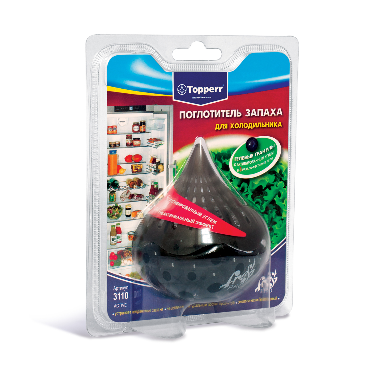 Гелевый поглотитель запаха для холодильника "ACTIVE" ,в пластиковом блистере.Наполнитель- активный гель черного цвета с повышенным содержанием активированного угля, являющегося лучшим натуральным адсорбентом. Для холодильников большого объёма.